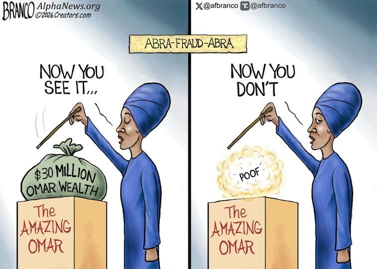 HomeFeaturedAbra-fraud-abra CartoonsCommentaryFeaturedilhan omarAbra-fraud-abra admin April 27, 2026 0Points 0 7 FacebookTwitterPinterestRedditEmail Source link admin Jimmy Kimmel and Others Continue Their Dehumanization Campaign Against Conservatives – RedState Former J6 Prosecutor Heads to Jail After Bizarre Stabbing Case—Why ‘Lectern Guy’ Is Not Happy About It – RedState Hakeem Jeffries Has a ‘Crossing the Rubicon’ Moment, and There May Be No Turning Back From Here – RedState Lee Zeldin Drops the Receipts on Rosa DeLauro in Fiery Budget Hearing Exchange – RedState Dems Called Out by VA Supreme Court Justices Over Brazen Gerrymander Power Grab – RedState Jennifer Siebel Newsom’s Sermon on Respecting Women in Media Ignores Some Inconvenient Facts – RedState Mehek Cooke: Left’s Rhetoric Fuels Climate of Violence Against Trump