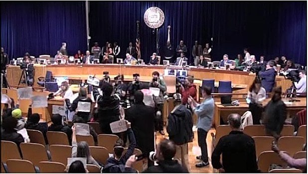 Council President J.P. Morrell moved to suspend public comments after protesters demanded that city officials establish “ICE free” zones on public property. Protesters began screaming at council members and were thrown out of the premises.