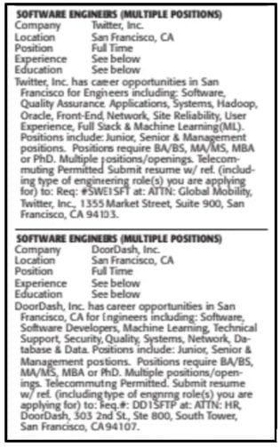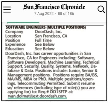 For years, DoorDash required U.S. applicants responding to PERM labor certification job ads to mail in physical resumes, rather than apply through the company’s standard electronic hiring systems.