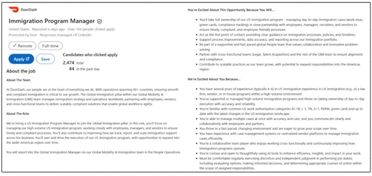 DoorDash is currently hiring an Immigration Program Manager, a staffer tasked with overseeing high-volume visa and green card sponsorship, managing compliance, coordinating with immigration law firms and scaling immigration operations across the Americas.