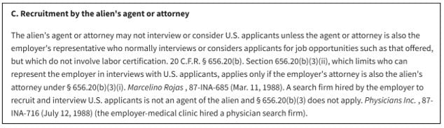 The regulation continues by clarifying that neither the foreign worker nor his or her agent or attorney may interview or consider U.S. applicants during PERM recruitment unless they are the employer’s regular hiring representative for comparable non-PERM roles.