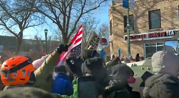 In video footage exclusively obtained by the Daily Caller News Foundation, a green armored vehicle is seen barreling down the streets of the city as protesters began to surround and touch it, with some giving it the middle finger and others shouting, “Fuck ICE [Immigration Customs and Enforcement]!” One protestor, wearing a headscarf, appears to grab the vehicle’s mirror, while other members of the crowd are seen brandishing an upside down American flag and a sign bearing the words, “ICE Out Now.”
