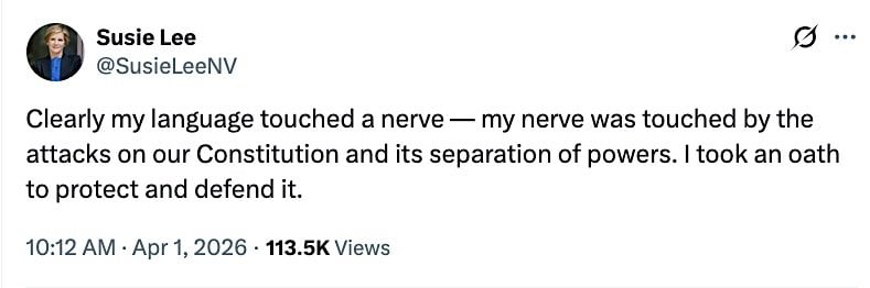 After deleting her remark, she posted a follow-up message, indicating: “Clearly my language touched a nerve – my nerve was touched by the attacks on our Constitution and its separation of powers. I took an oath to protect and defend it.”