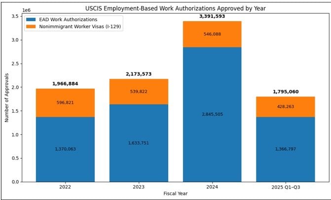 The data, drawn from USCIS’s “All USCIS Application and Petition Form Types (Fiscal Year)” tables, reflects approvals for work authorization documents (EADs) and employer-sponsored nonimmigrant worker petitions, both of which permit individuals to enter or remain in the U.S. workforce.