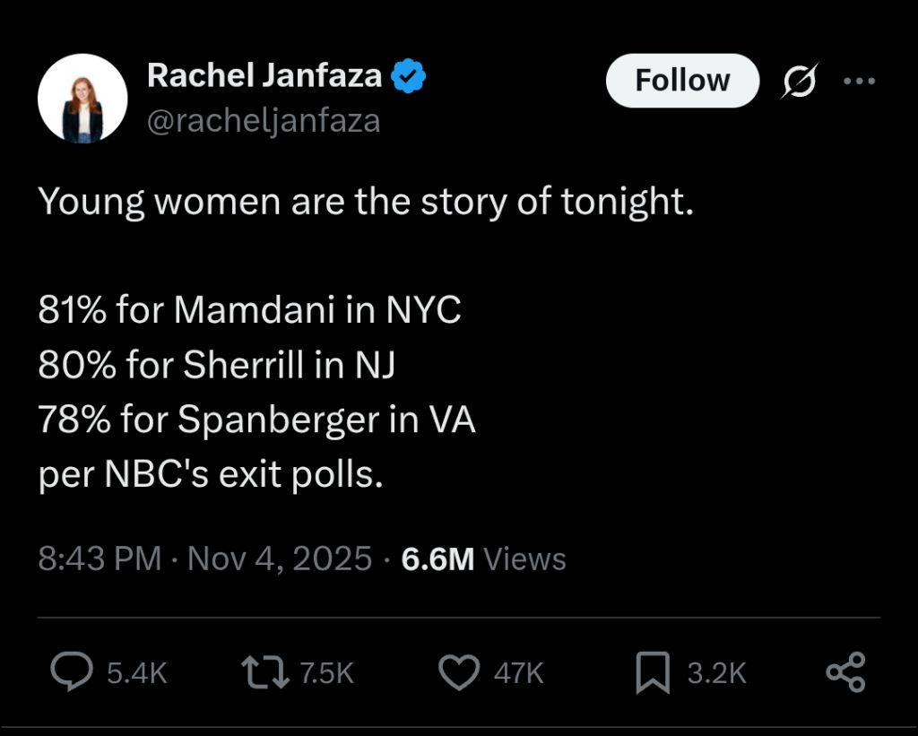 Second, they demand that good men protect and provide for women who are overwhelmingly leftist. Good men have no agency of their own! They only exist to provide utility to young women, including the 84% of young women who vote for Sharia Law and communism. Good men can have no plans of their own, and they are not allowed to have any standards for women that might exclude women who voted for Mamdani. NO! Good men are just walking cash dispensers who must also risk their lives to fight the criminals that their Mamdani-supporting wives let in through the doors and windows of the home. And they must do it without using violence, and certainly not with firearms! Only the criminals can have guns.