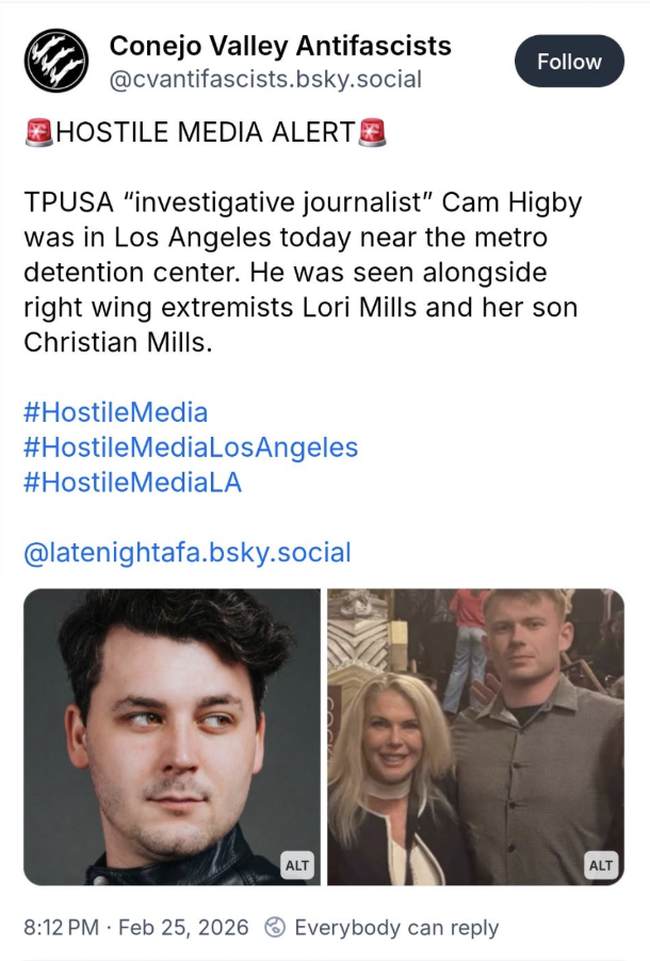 For example, former Assembly candidate and Ventura County GOP 1st Vice-Chair Lori Mills. (Disclosure: Mills and I have been close friends since 2019.) Mills, her son, and independent journalist Cam Higby went to CHIRLA’s offices on February 25, 2026, to ask questions. They were filming in the public area outside the building and were harassed and threatened by employees.