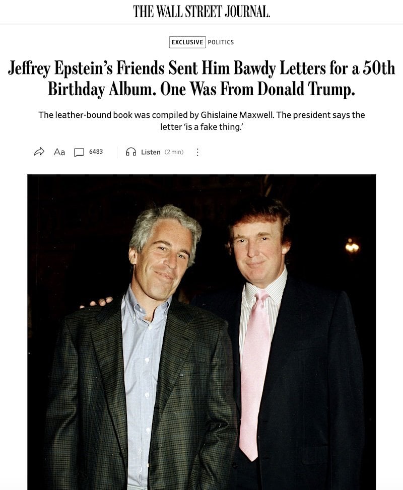 The Journal’s alleged hit piece from July 2025 was headlined: “Jeffrey Epstein’s friends sent him bawdy letters for a 50th birthday album. One was from Donald Trump.”