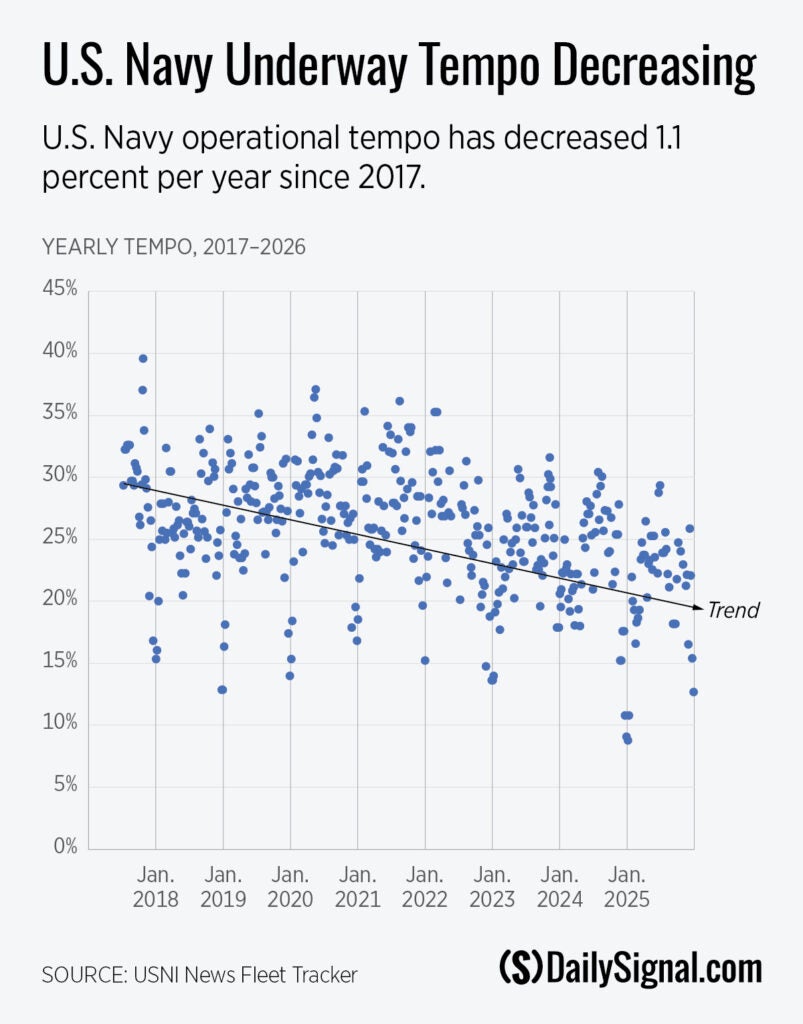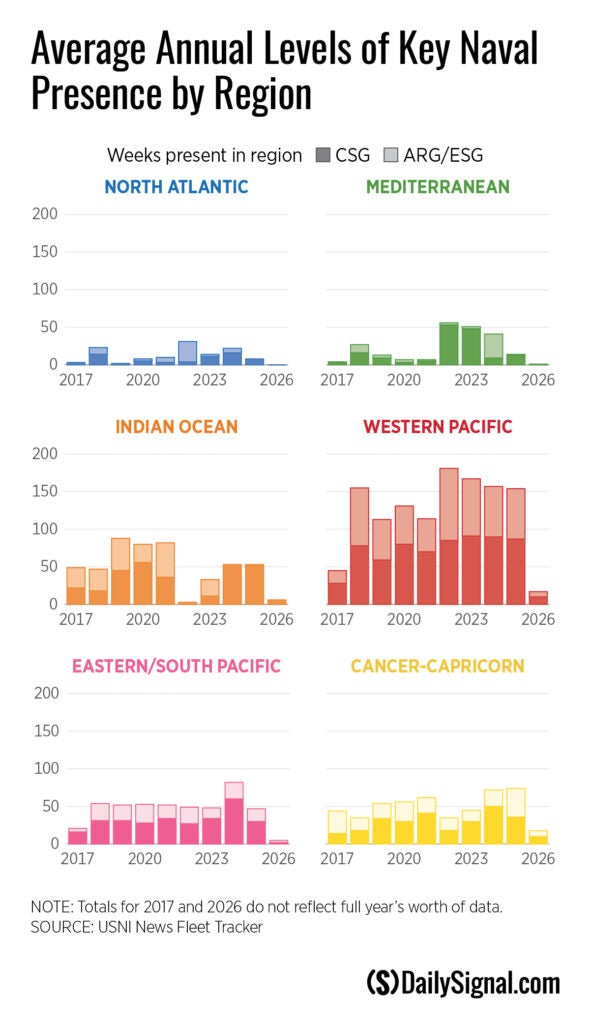 Each week, the U.S. Naval Institute Fleet Tracker has for years been reporting roughly 100 U.S. Navy warships deployed overseas. This total of warships deployed has remained remarkably consistent from the 1980s through today. But the fleet supporting that presence has been halved. In the late Cold War, the Navy peaked at 594 battle-force ships in 1987. Today’s fleet hovers around 293 ships, which is well below what is assessed as necessary by The Heritage Foundation’s 2026 Index of U.S. Military Strength.