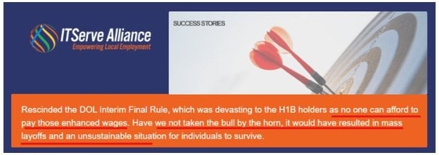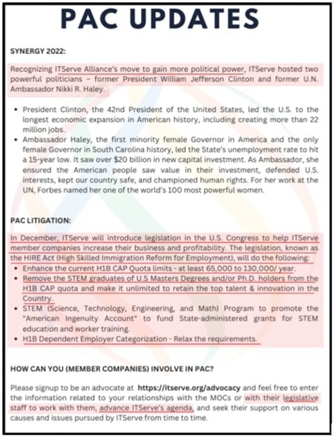 ITServe’s business model depends on one thing: a relentless and never-ending supply of cheap, controllable foreign workers. In a member newsletter, the organization openly admits that passing the HIRE Act is intended to “increase their business and profitability,” a blunt confession that reveals the economic model behind the movement. For ITServe, immigration expansion is not a policy preference; it is the fuel that powers an entire labor-replacement ecosystem.