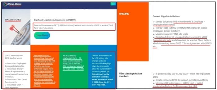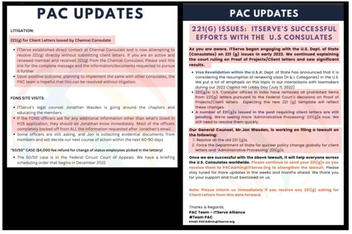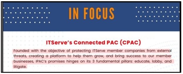 Internal ITServe documents show the organization had its litigation attorney pressure federal agencies, challenge enforcement rules and influence U.S. consulates overseas. The organization openly listed the removal of client letters and the reduction of 221(g) administrative processing and other anti-fraud safeguards as major PAC achievements.