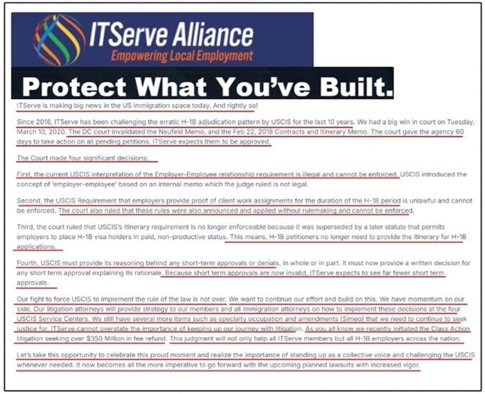 Through a series of lawsuits filed against the federal government, the organization has systematically dismantled the core protections intended to prevent fraud, wage suppression and worker displacement. One of its most consequential targets was the 2010 Neufeld Memo, which required staffing firms to demonstrate a genuine employer-employee relationship, actual supervision and verifiable work assignments before placing visa workers at third-party job sites. The memo was one of the last lines of defense against fake contracts, shadow projects and speculative employment. ITServe sued to overturn it and won.