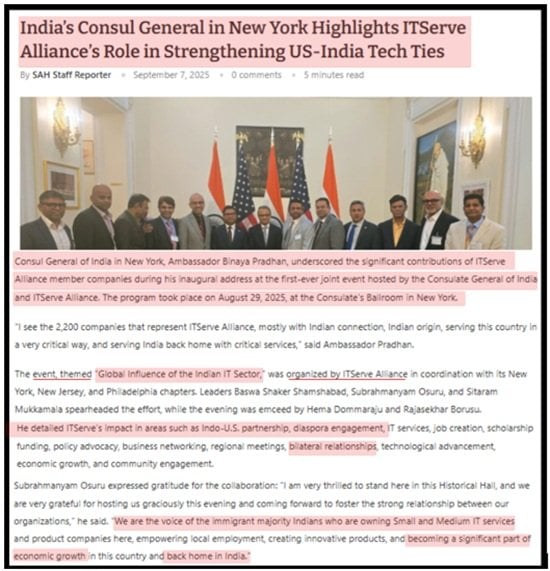 The foreign alignment of the organization is impossible to ignore. Indian consulates and senior diplomats openly praise ITServe for strengthening India’s economic footprint inside the United States and enlarging the flow of Indian workers into the American labor market. At events such as the “Global Influence of the Indian IT Sector,” Indian officials have celebrated ITServe’s success in expanding bilateral ties through U.S. visa programs, framing the organization as an asset to India’s economy.