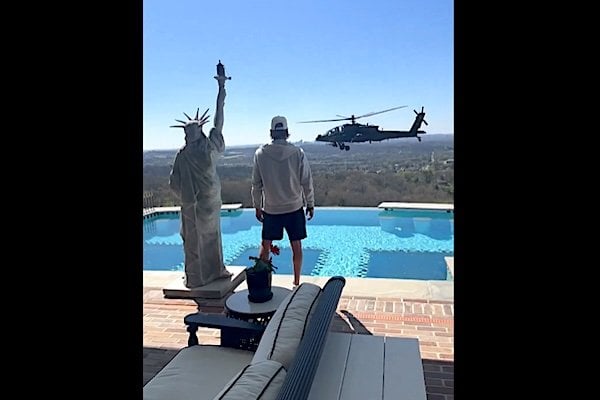 Kid Rock, a vocal supporter of President Donald Trump, shared the video of himself cheering and saluting the helicopters from the deck of his swimming pool at his “Southern White House,” saying on X: “This is a level of respect that s*** for brains Governor of California will never know. God Bless America and all those who have made the ultimate sacrifice to defend her.”