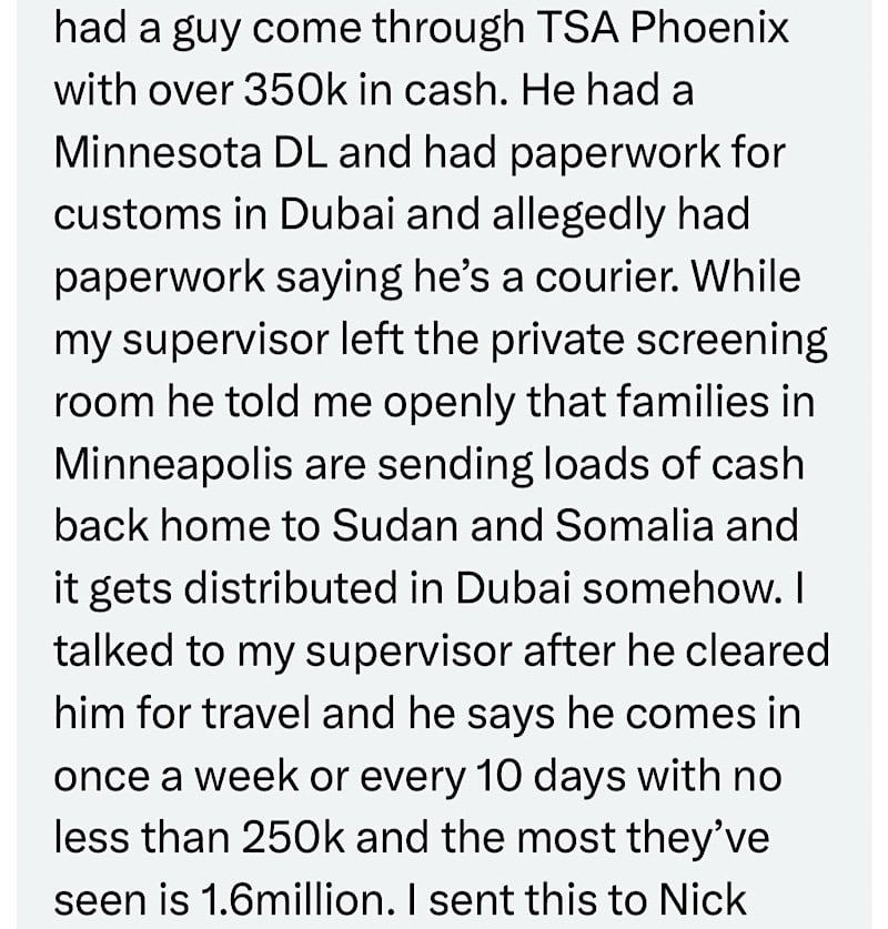 On Tuesday, LibsofTikTok posted: “I just received a message from a TSA agent in Phoenix who tells me a Somali man with a Minnesota DL (driver’s license) flies through Phoenix every 7-10 days with a suitcase of around $250k cash. He told agents that families in Minnesota send cash back home to Sudan and Somalia through Dubai and he is a registered courier.